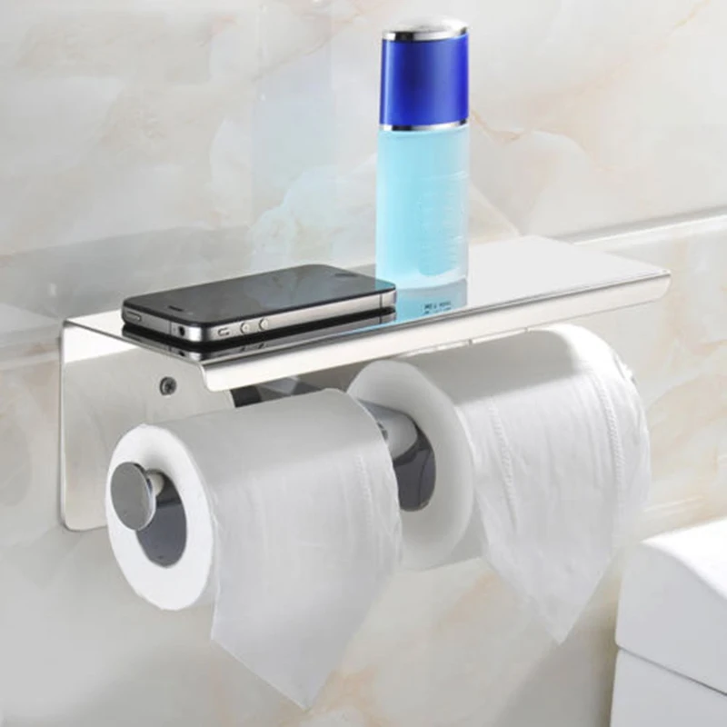 Wall Mount Double Toilet Paper Holder Shelf Bathroom Tissue Stainless Two 2 Roll Luxury Space Alumi